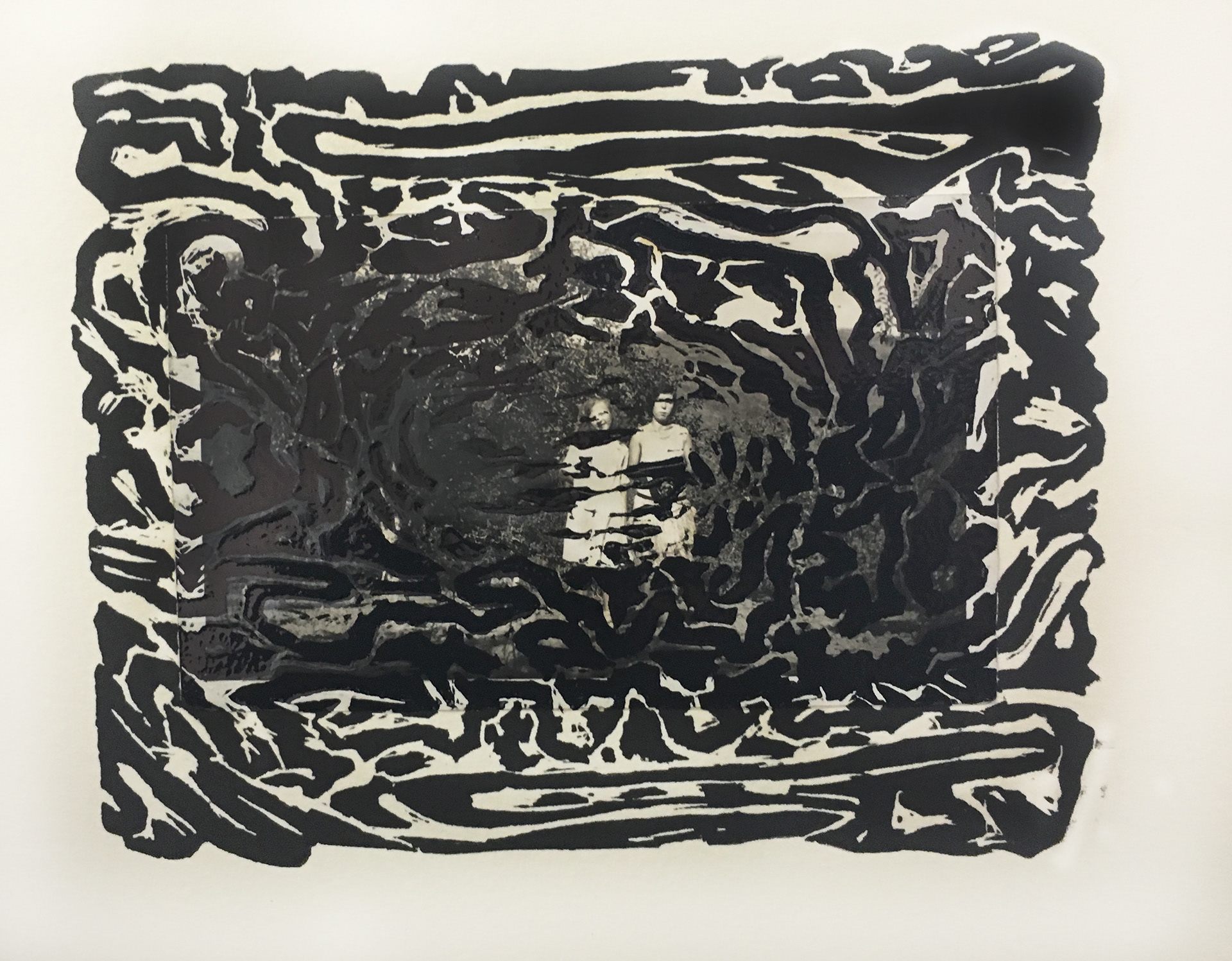One of a series of linoleum prints on adhesive mounted found photographs.